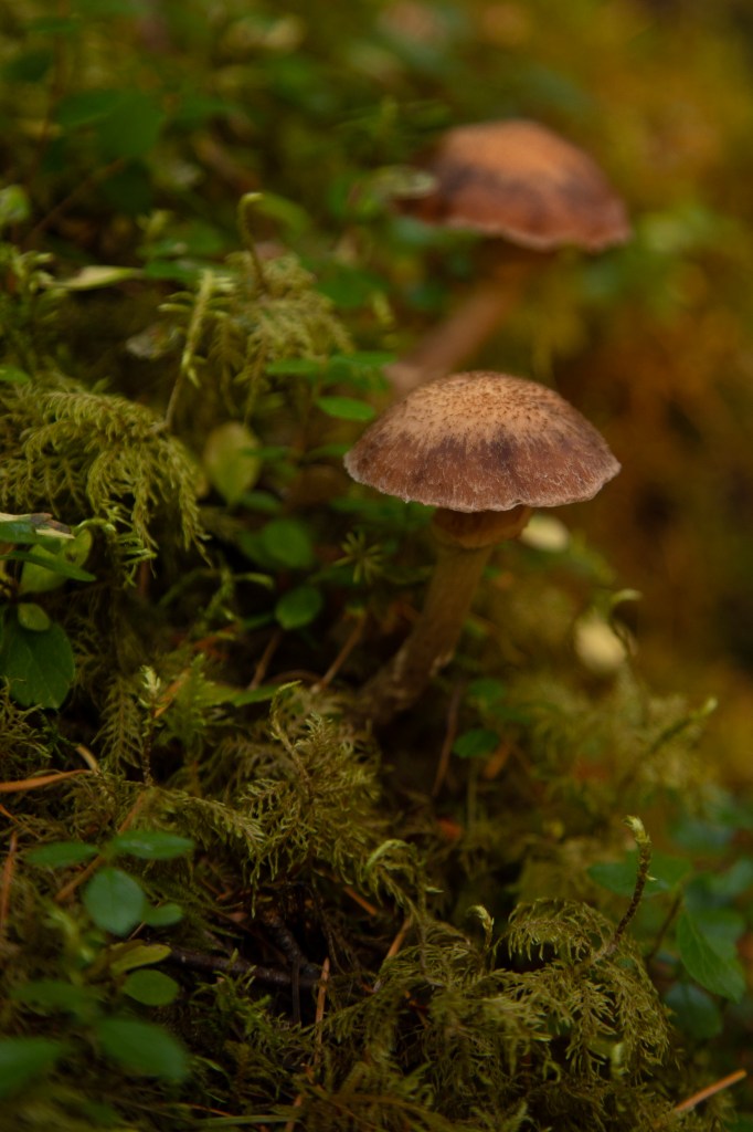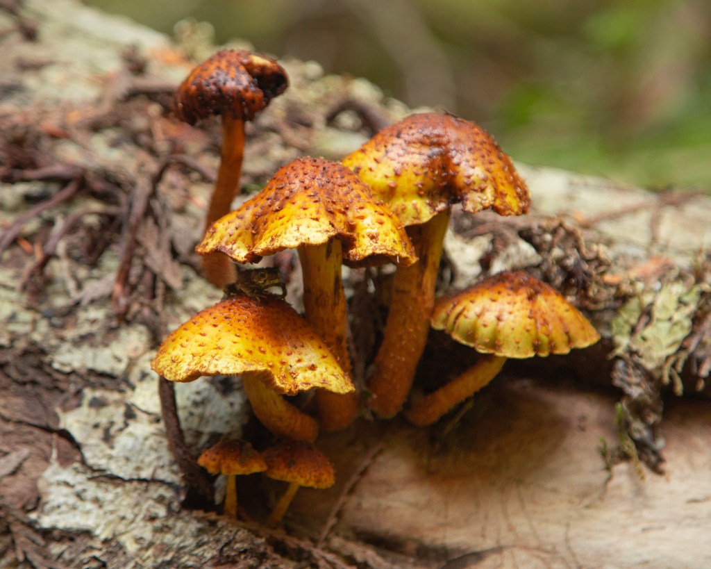 On one of the hikes, we came across a boatload of mushrooms. One of them had this little frog hiding under a mushroom umbrella – hiding like Waldo below!